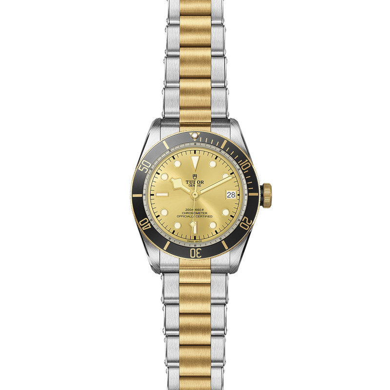 A versão Steel & Gold combina aço e ouro amarelo, mantendo os códigos históricos do Black Bay, com luneta giratória e coroa revestidas a ouro.