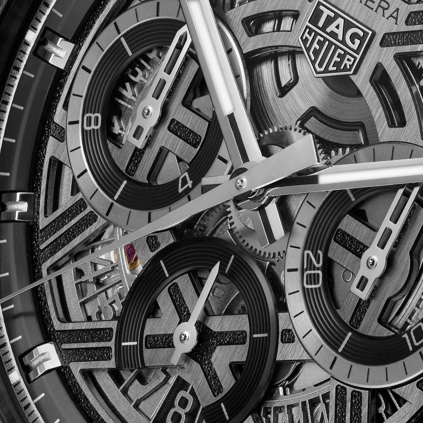 Mergulhe na essência do automobilismo com o impressionante TAG Heuer Carrera Chronograph de 44 mm. Totalmente revestido em preto, faz uma afirmação ousada de elegância e força, projetado para aqueles que vivem a emoção da corrida.